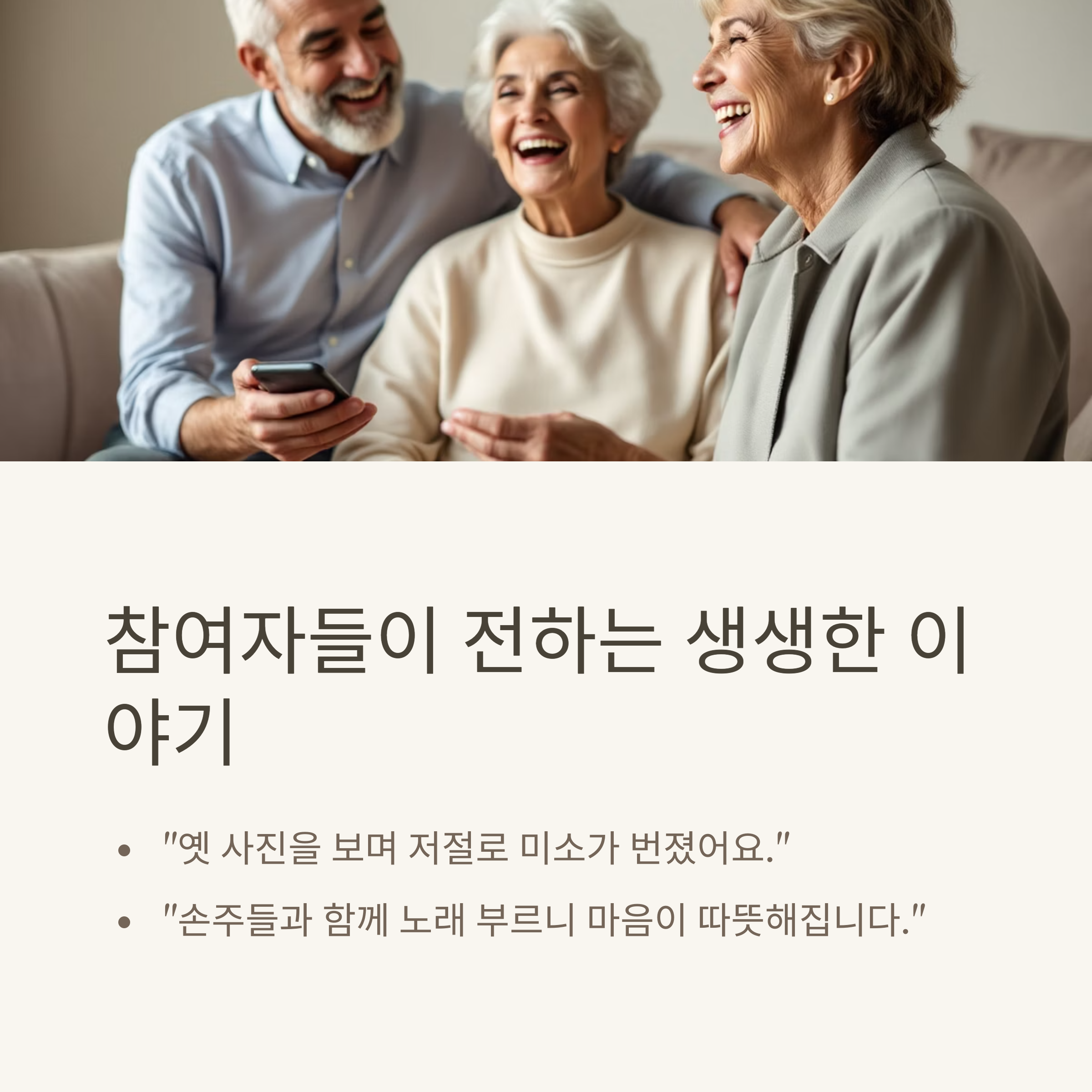과거의 따뜻한 기억을 다시 떠올리며 자신을 되돌아보는 시간은 노인들의 자존감과 사회적 유대감을 회복시키는 데 큰 역할을 합니다. 특히 사진, 음악, 향기 등 다양한 자극을 통해 일상의 이야기를 풀어낼 수 있는 기회를 제공함으로써 정서적 안정과 인지 기능 유지에 실질적인 도움을 주고 있습니다.