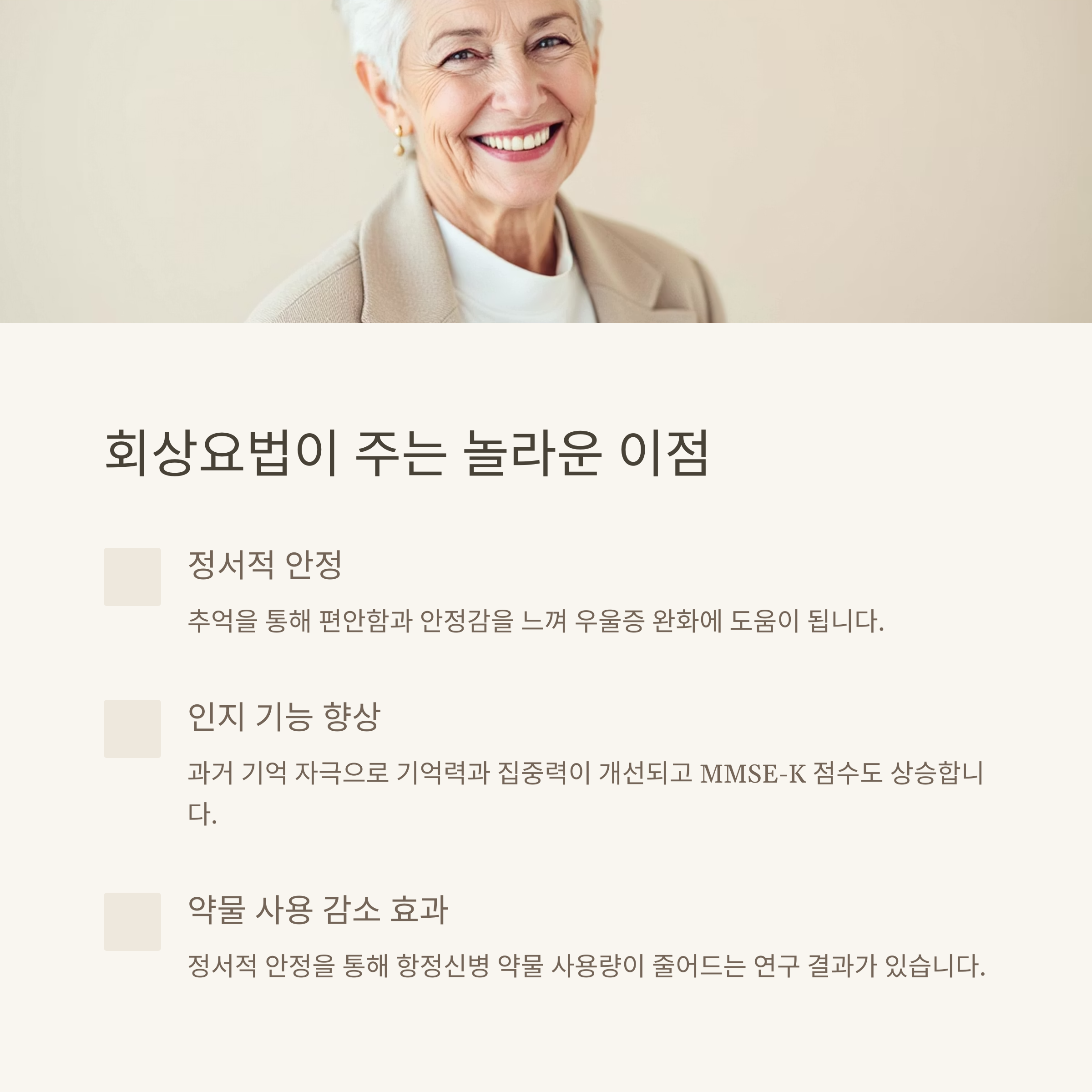 | 과거 기억을 되살려 정서적 안정에 도움을 줍니다. | MMSE-K 검사 결과, 수치적 향상이 입증되었습니다. | 미국, 호주 등지에서 폭넓게 활용되고 있습니다. |