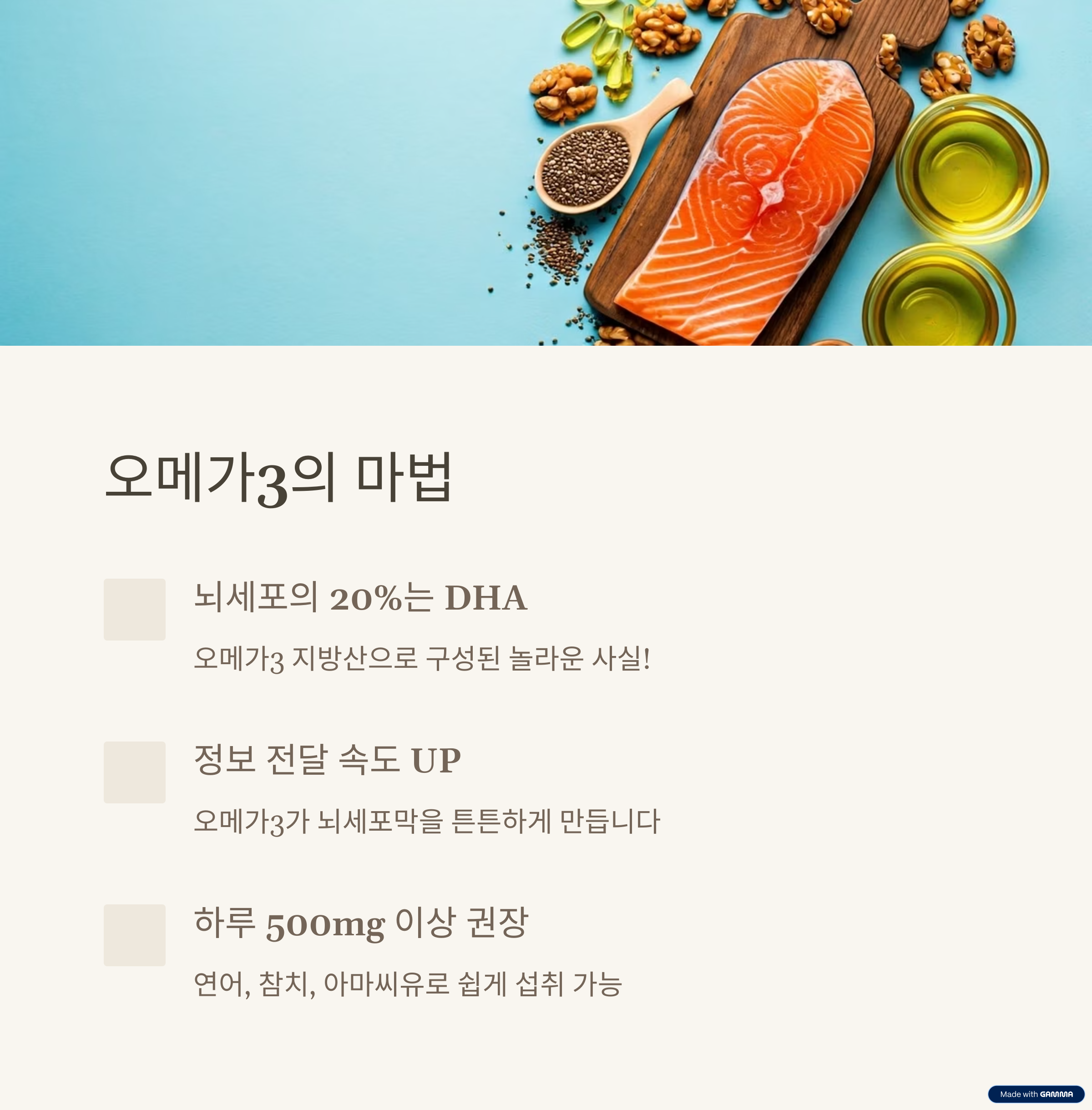 오메가 3 지방산, 특히 DHA와 EPA는 뇌세포막의 핵심 구성 성분입니다