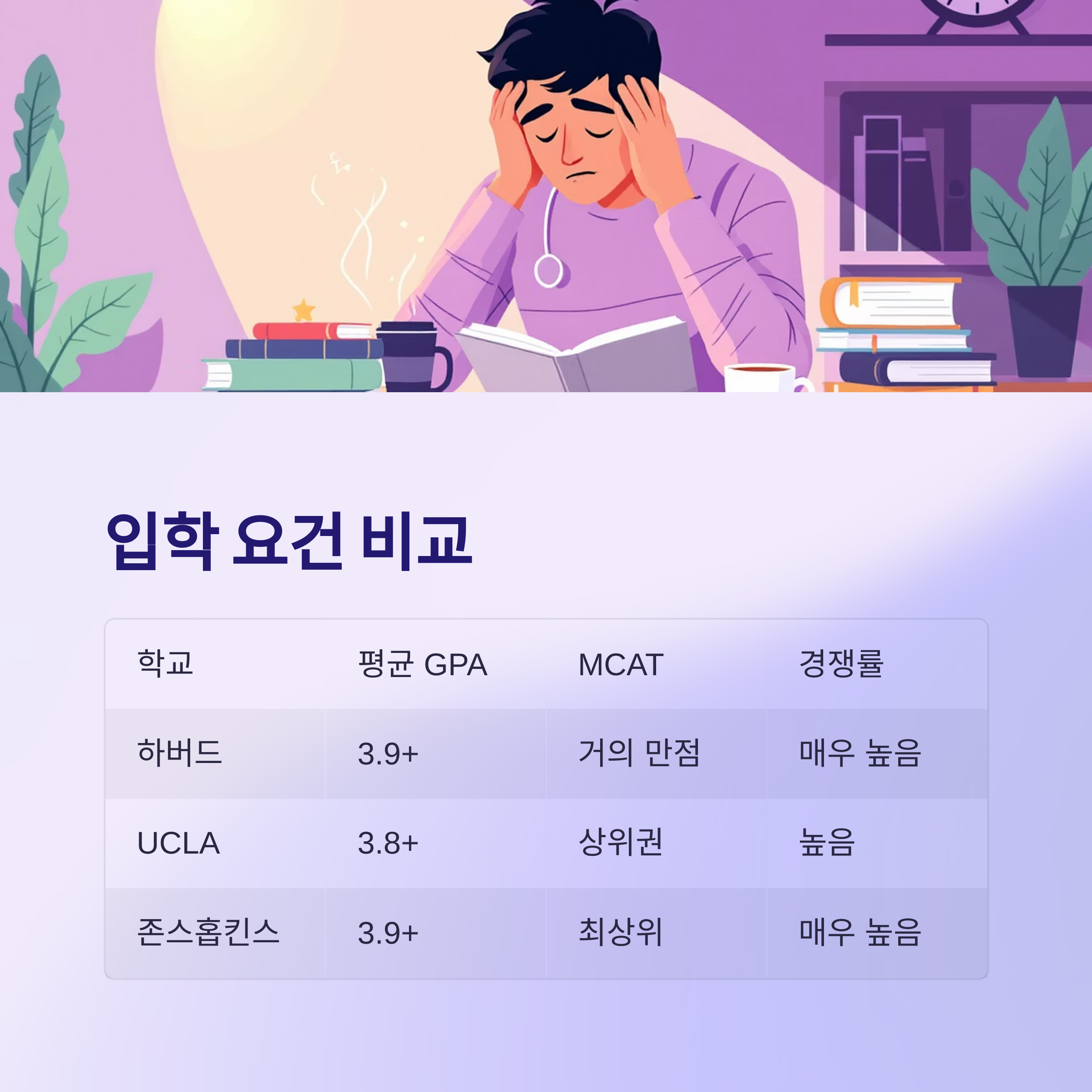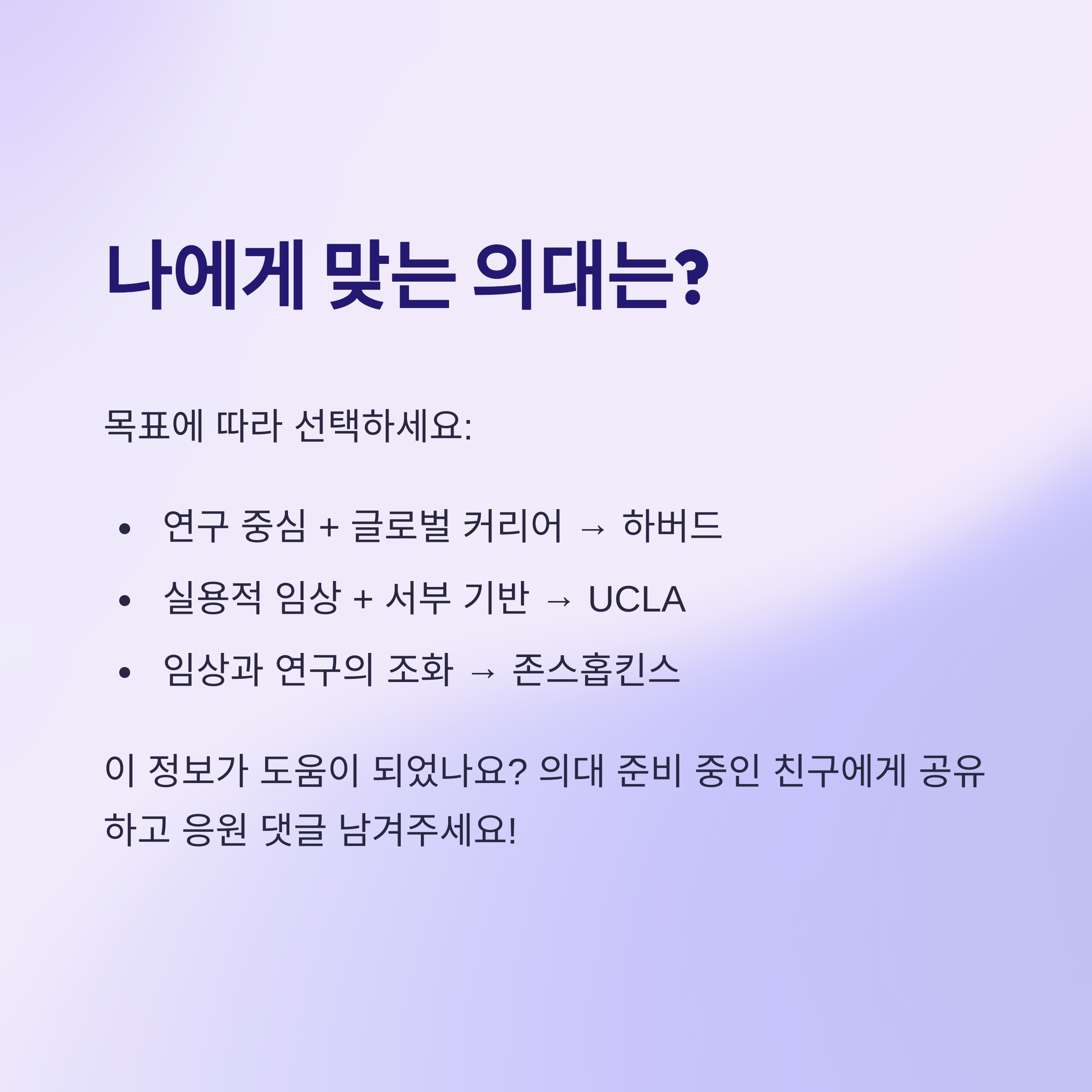 - 연구 중심 + 글로벌 커리어 → 하버드 - 실용적 임상 + 서부 커뮤니티 기반 → UCLA - 임상과 연구의 조화 + 레지던시 준비 철저 → 존스홉킨스 미국 의대 입시는 경쟁이 치열하고 준비할 것도 많지만, 목표와 계획이 확실하다면 충분히 도전해 볼 만해요. 정보를 충분히