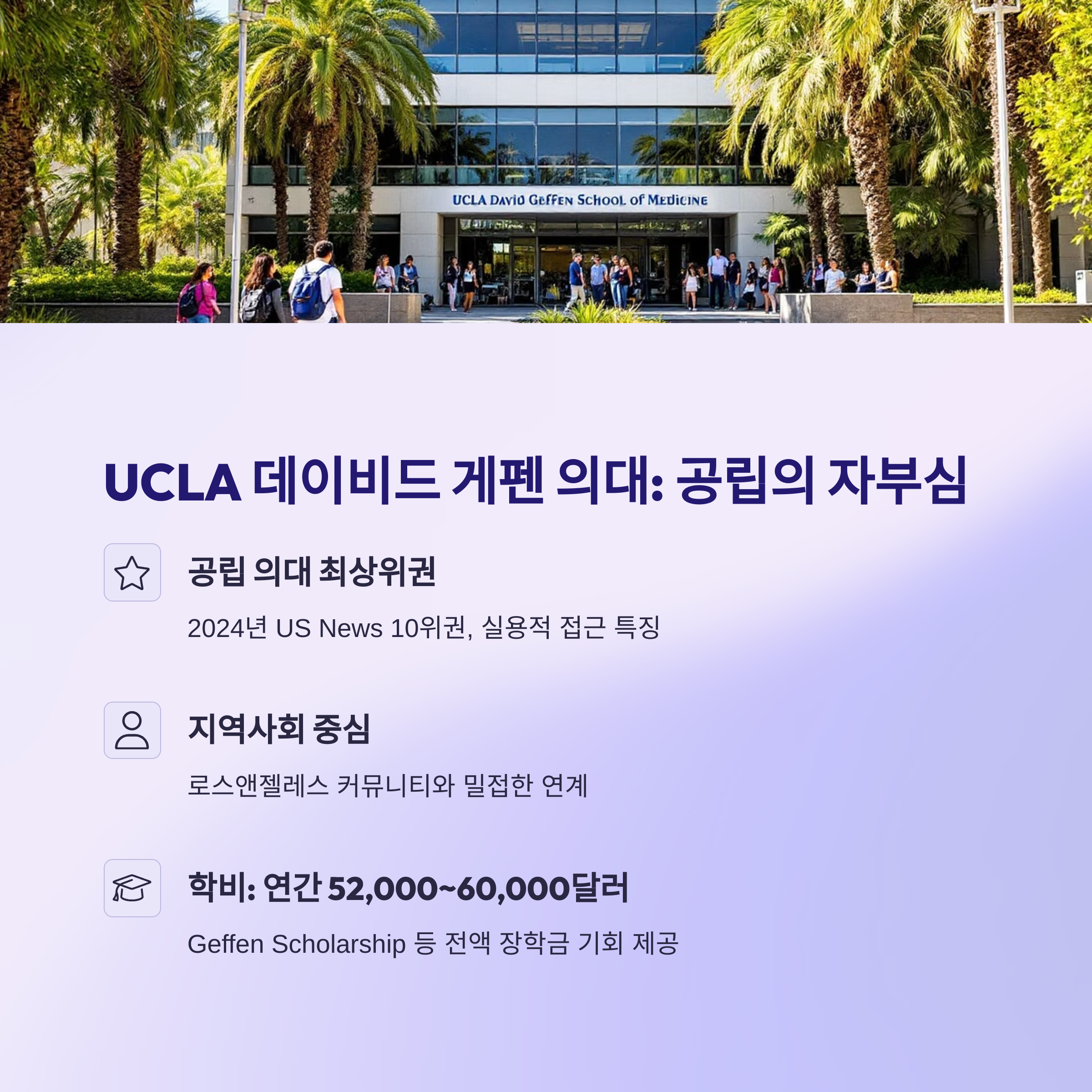 UCLA 의과대학의 정식 명칭은 David Geffen School of Medicine at UCLA예요. 미국 서부를 대표하는 의과대학으로, 2024년 US News 순위에서는 10위권 내에 들었고, 공립 의대 중에서는 항상 상위권에 있습니다. UCLA 의대는 하버드와 비교해 상대적으로 실용적인 접근이 특징입니다.