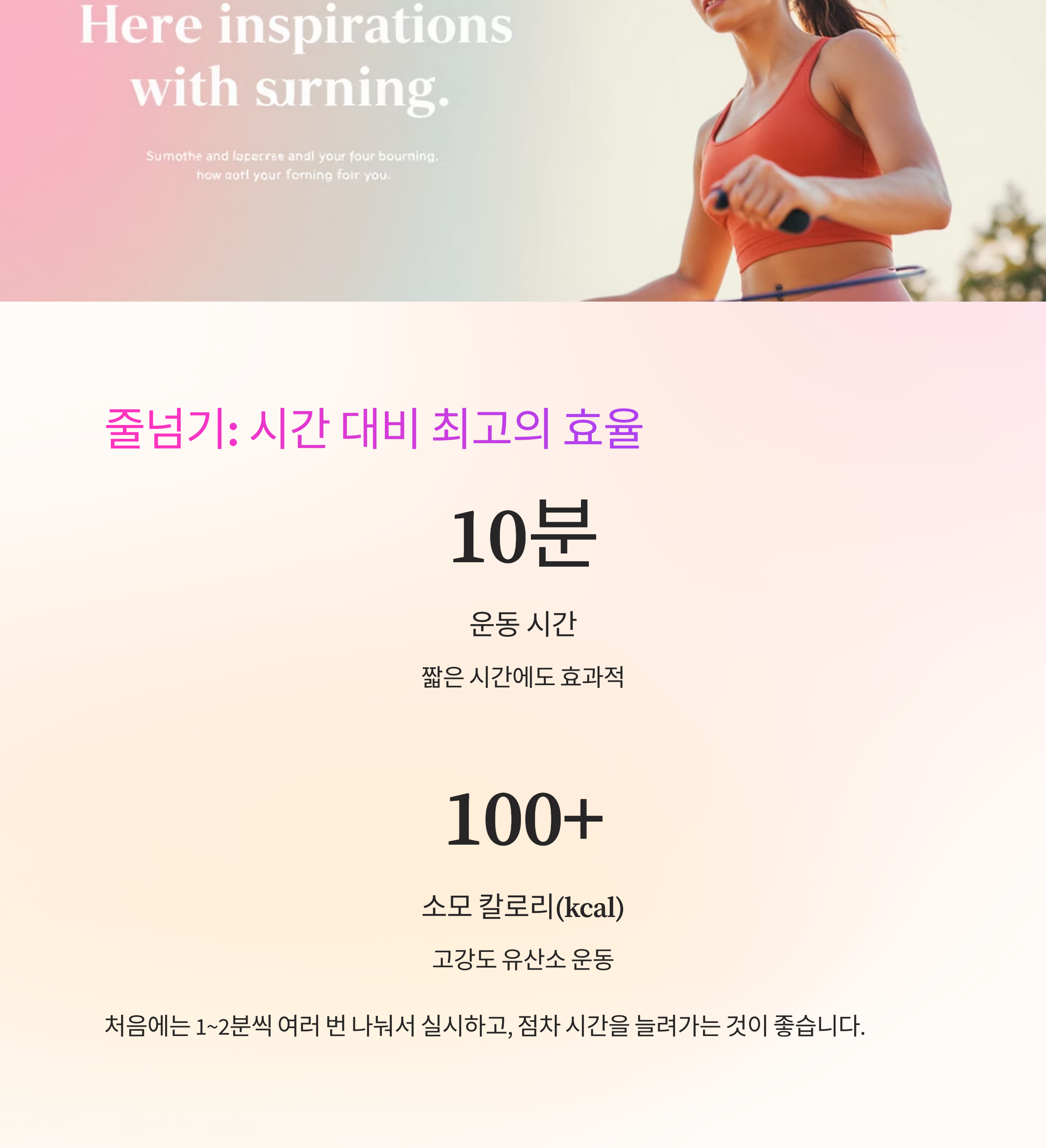 10분 줄넘기 = 100kcal! 짧은 시간에 많은 칼로리를 소모할 수 있어 효율적인 여름 다이어트 운동입니다. 전신을 사용하는 만큼 체지방 감량 효과도 탁월합니다.