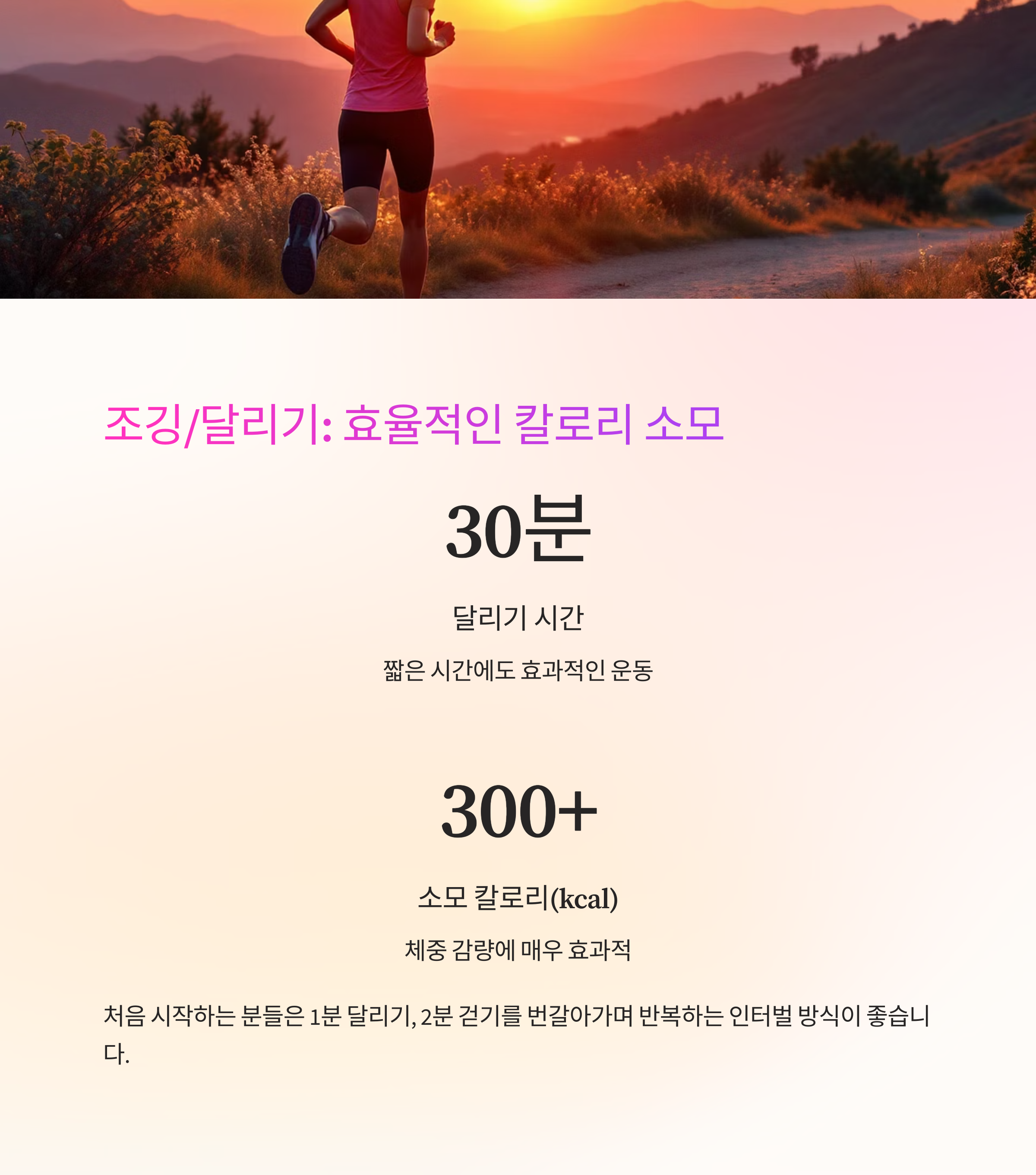 조깅은 30분에 약 300kcal 이상 소모하며 하체 근육과 심폐 기능을 강화해줍니다. 1분 달리기 + 2분 걷기 식의 인터벌 방식으로 시작하면 부상 없이 꾸준히 이어갈 수 있습니다.