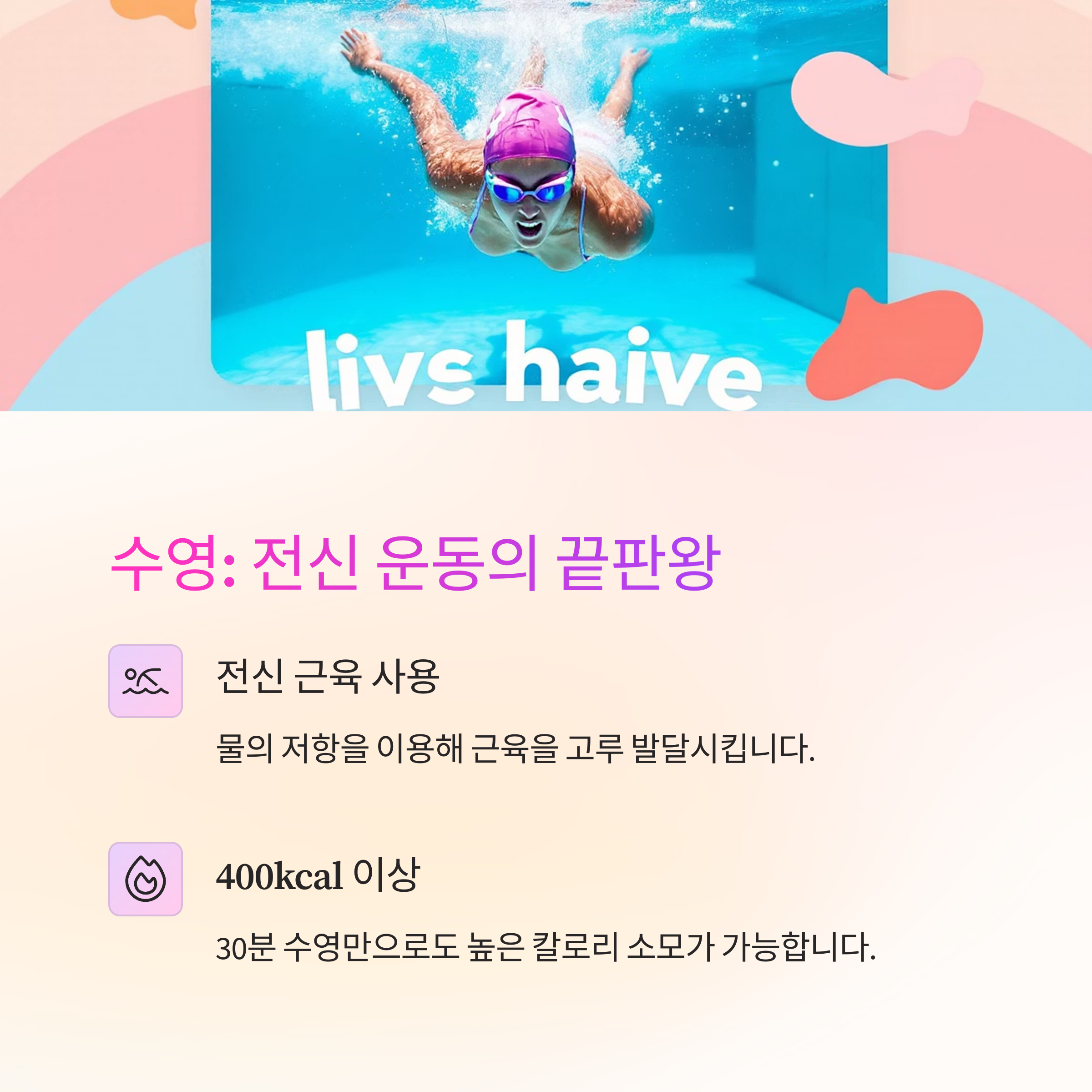 물의 저항을 이용한 수영은 관절에 부담이 없고 전신을 고르게 사용하는 운동입니다. 30분 수영 시 최대 400~500kcal까지 소모되어 체중 감량과 근력 강화 모두에 효과적인 여름 다이어트 운동입니다.