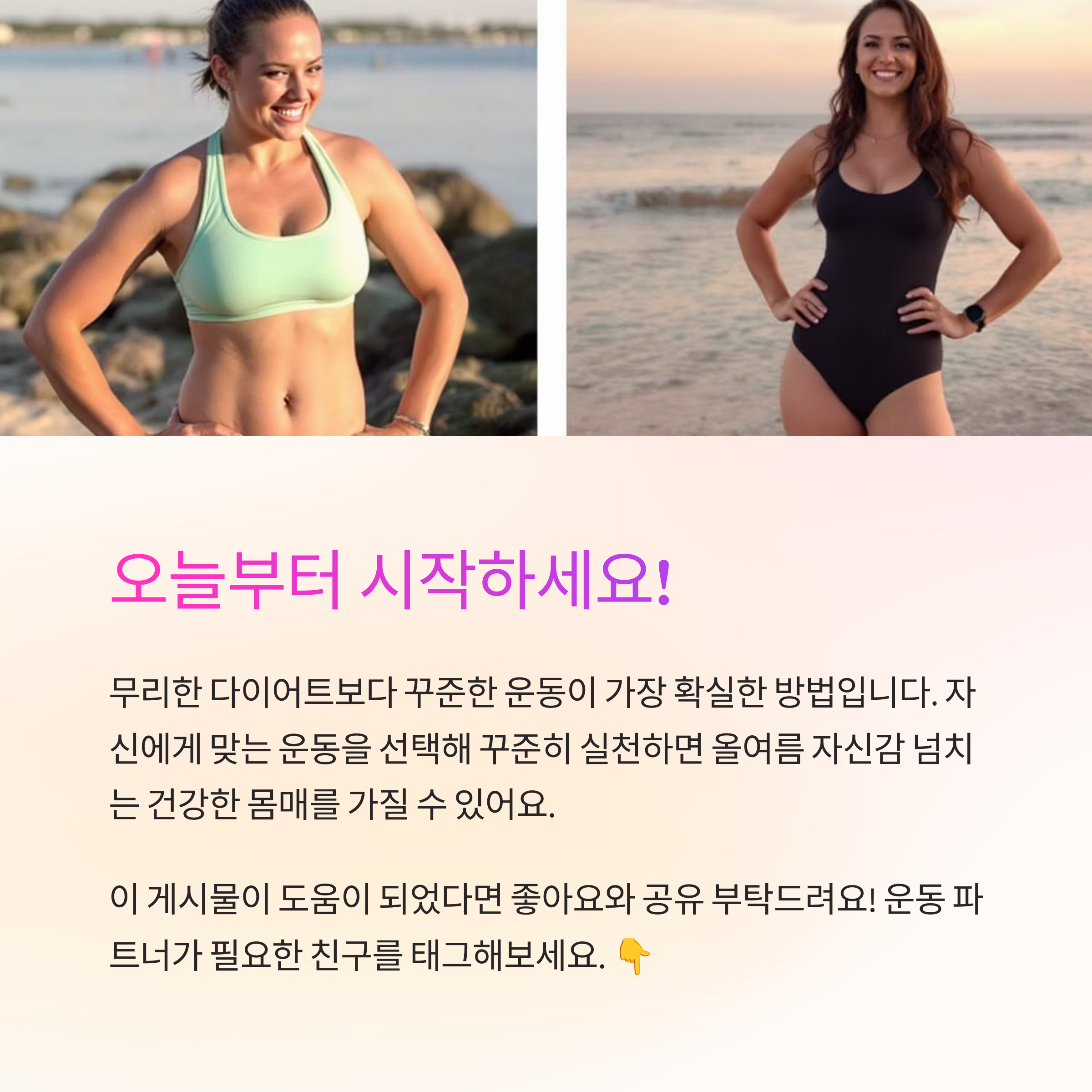 지금 당장 하나만이라도 실천해보세요. 작은 움직임이 결국 당신을 더 건강하고 멋진 모습으로 이끌어줄 것입니다. 올여름, 당신도 할 수 있습니다!