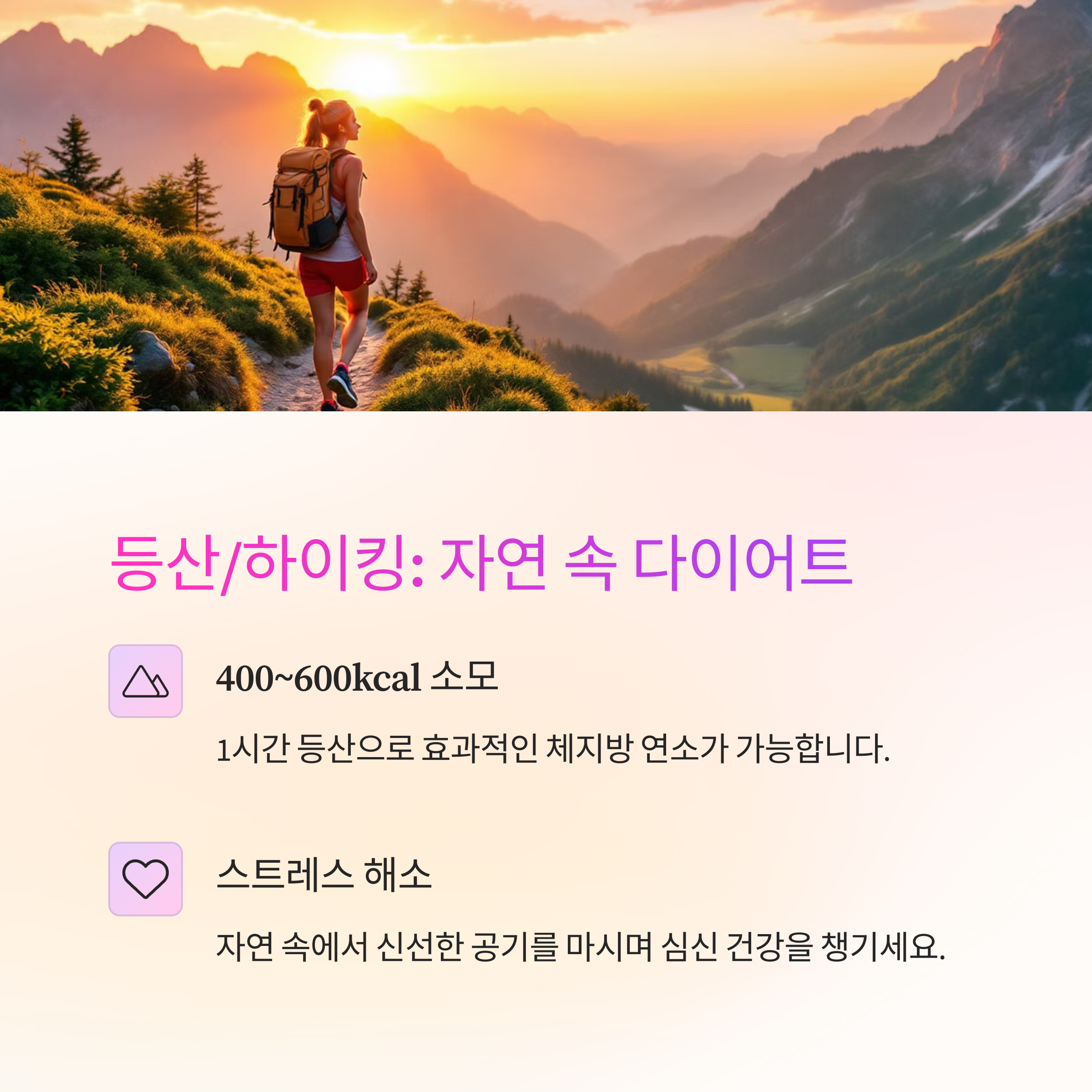하체 근육 강화, 칼로리 소모, 스트레스 해소를 동시에 잡을 수 있는 등산! 1시간 산행 시 최대 600kcal까지 소모되며, 이른 아침이나 그늘 코스를 활용하면 여름철에도 안전하게 즐길 수 있습니다.