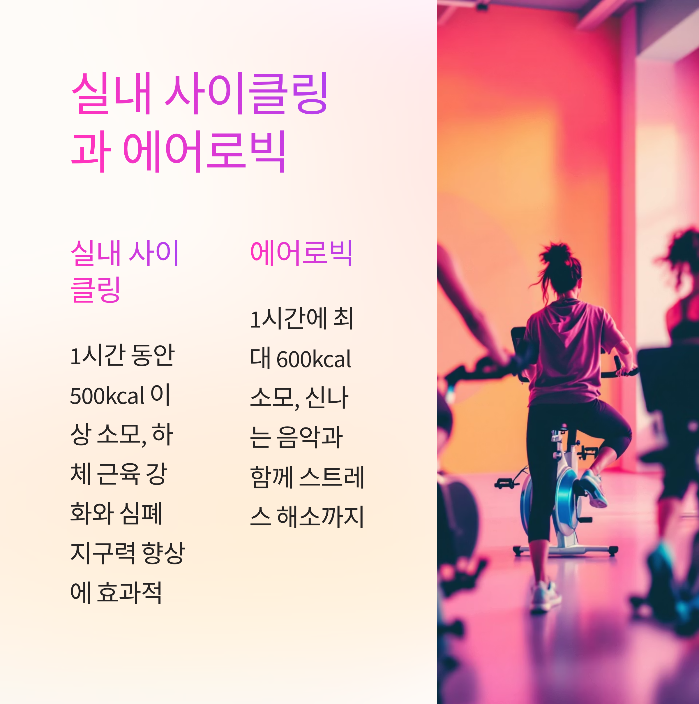 실내 자전거는 날씨와 상관없이 꾸준히 할 수 있어 바쁜 직장인에게 적합합니다. 하체 근력 강화와 지구력 향상, 1시간에 500kcal 이상의 칼로리 소모로 감량 효과도 우수합니다.