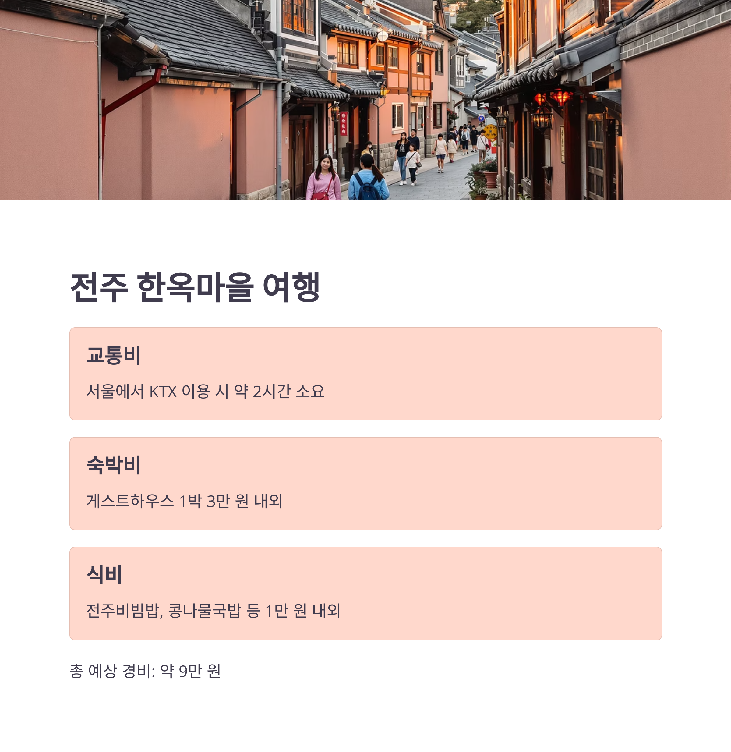 숙박은 게스트하우스를 이용하면 1박에 3만 원 내외, 식사는 전주비빔밥과 콩나물국밥 등 1만 원 이하.
