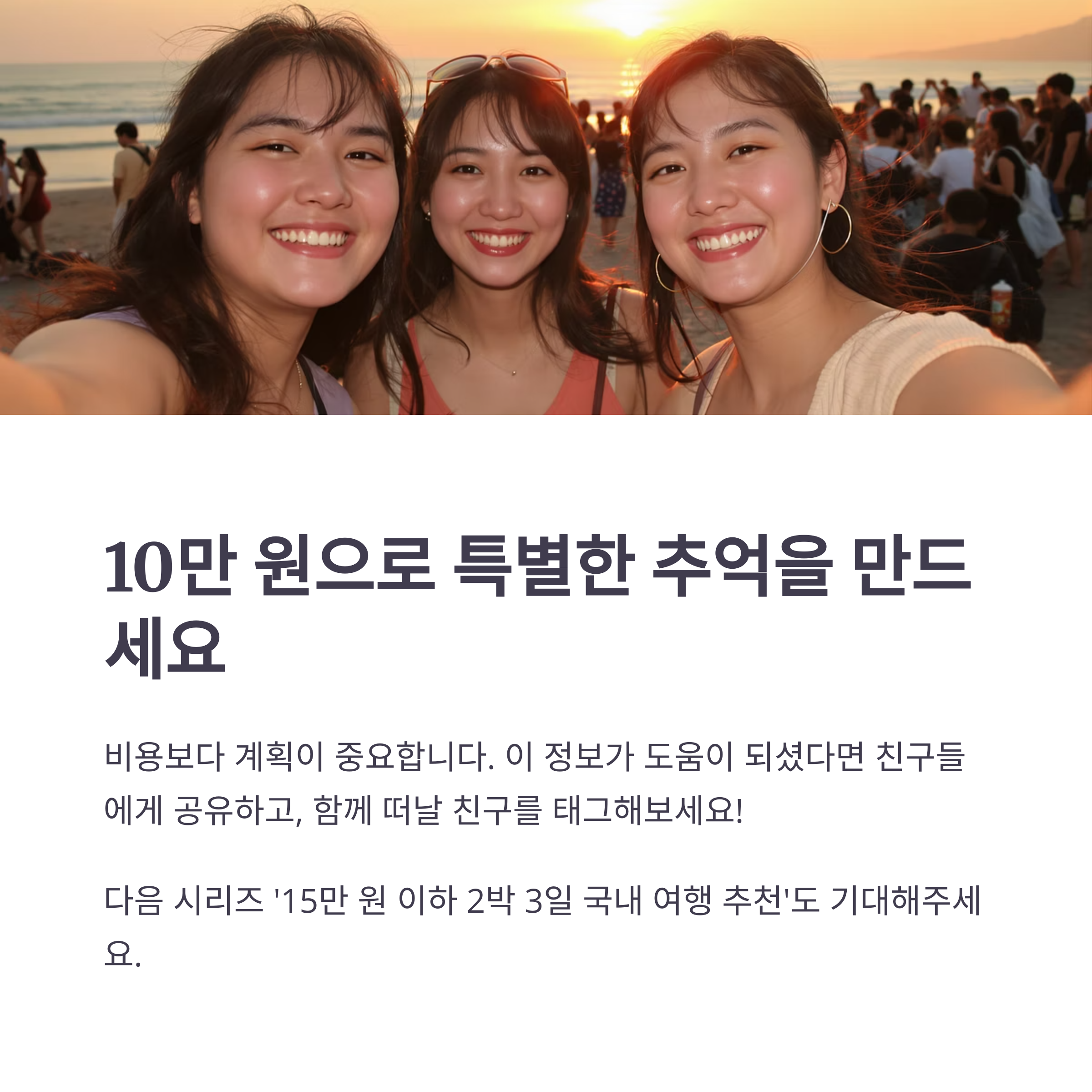 다음 시리즈에서는 15만 원 이하 2박 3일 국내 여행 추천 콘텐츠가 예정되어 있습니다.