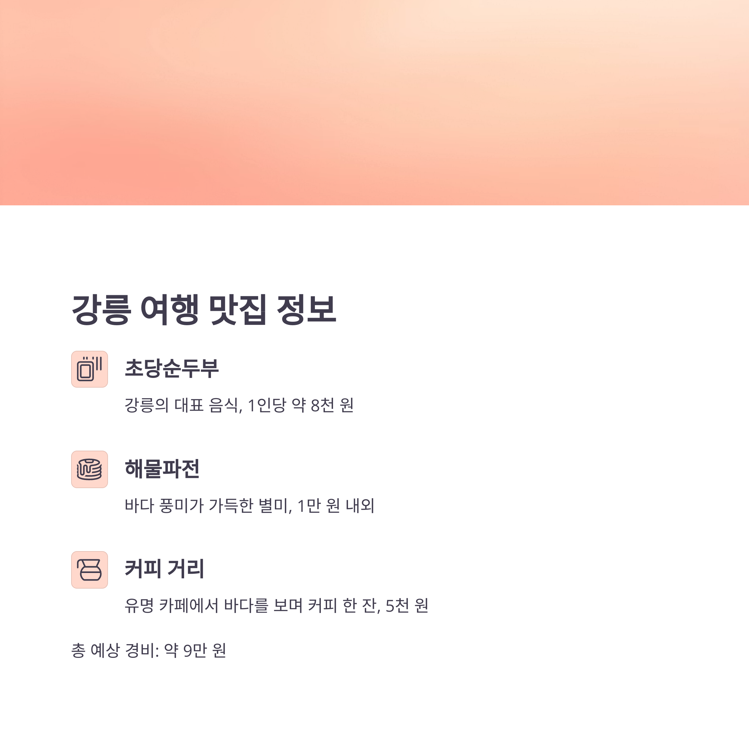 숙박은 게스트하우스 기준 1박에 4만 원, 초당순두부나 해물파전 식사는 1만 원 내외.