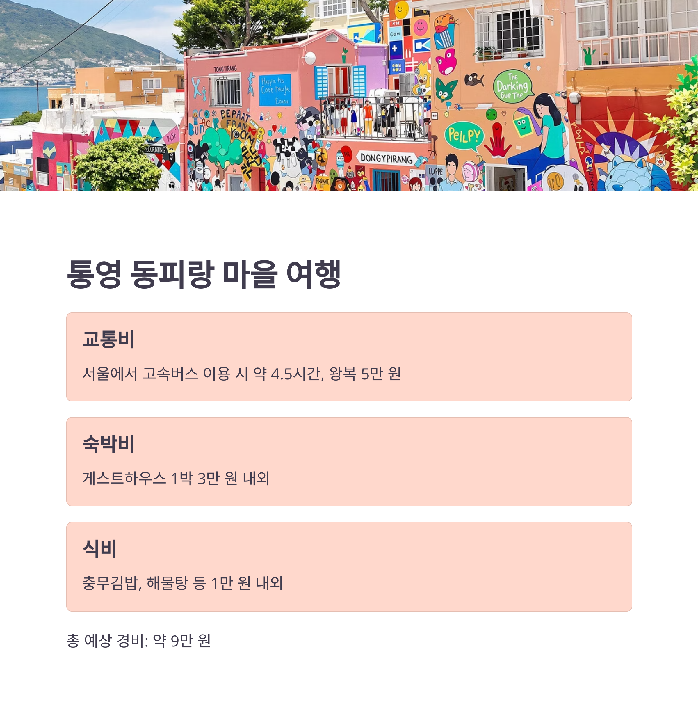 게스트하우스 숙박은 3만 원 내외, 식사는 충무김밥과 해물탕 기준 1만 원 이내.