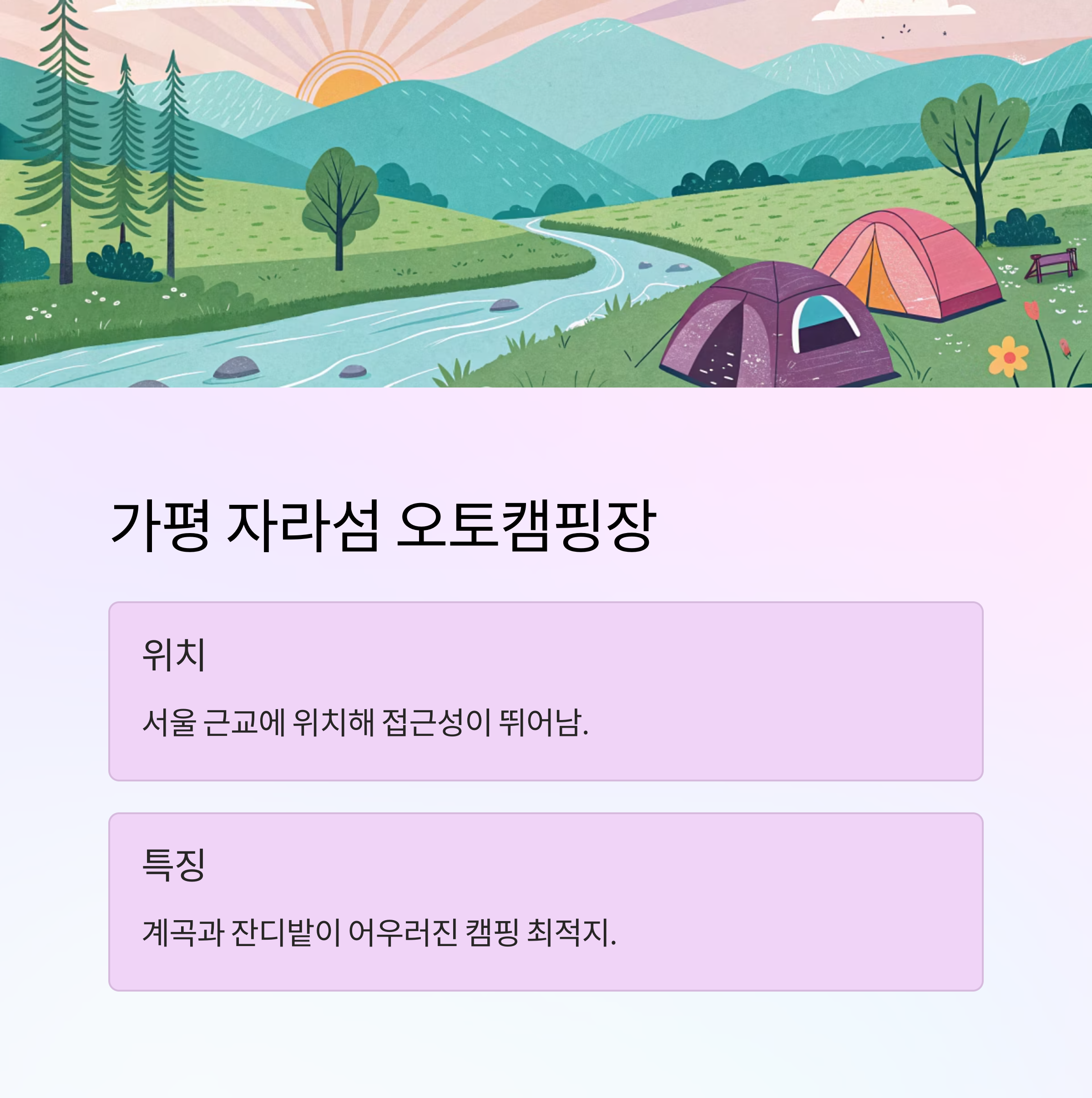 1. 가평 자라섬 오토캠핑장 – 서울 근교, 계곡과 잔디밭 캠핑 최적
