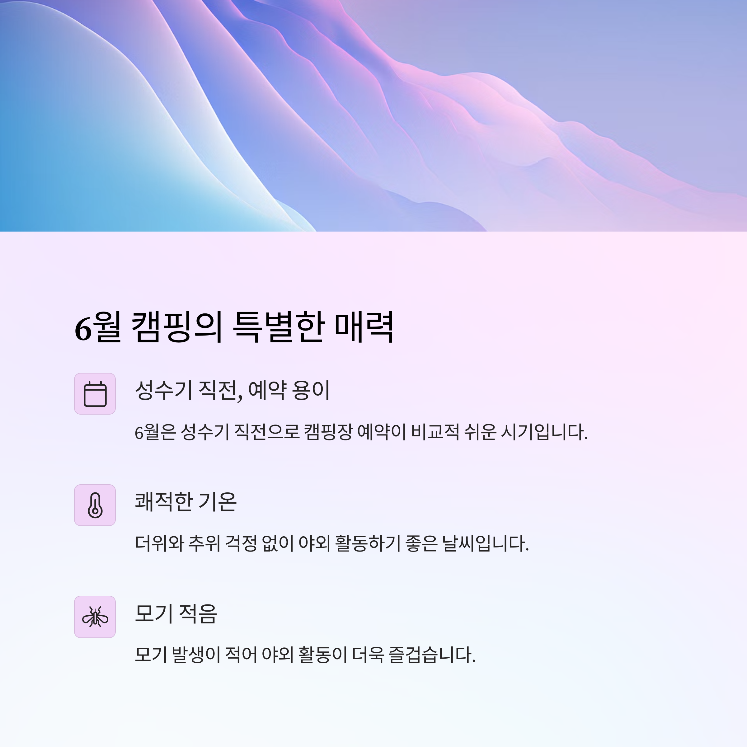6월은 성수기 직전이라 캠핑장 예약이 비교적 쉬우며, 기온도 쾌적하고 모기 발생도 적어 야외 활동에 적합한 시기입니다.